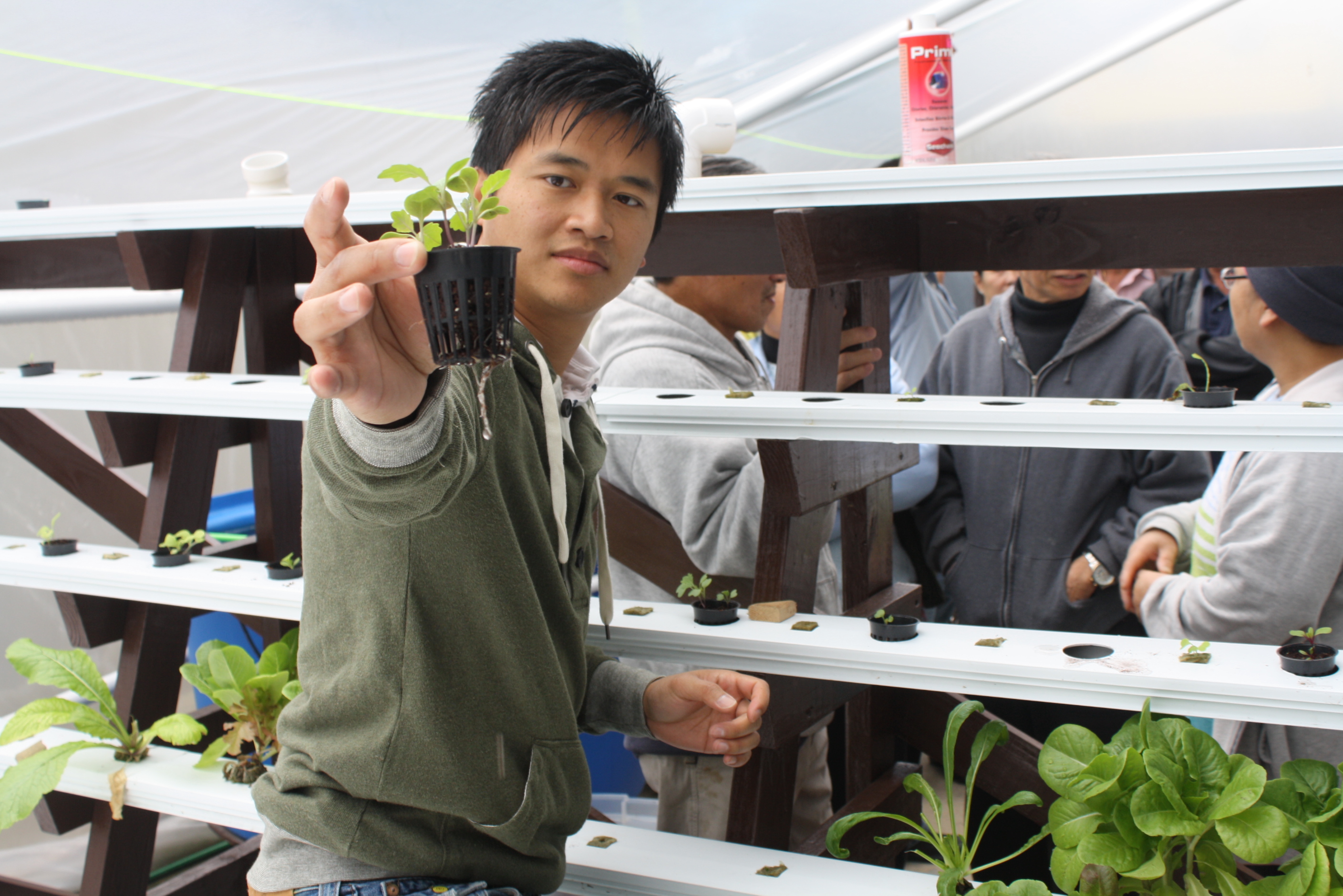 Daniel Nguyen explains the aquaponics process to members of the Vietnamese community.