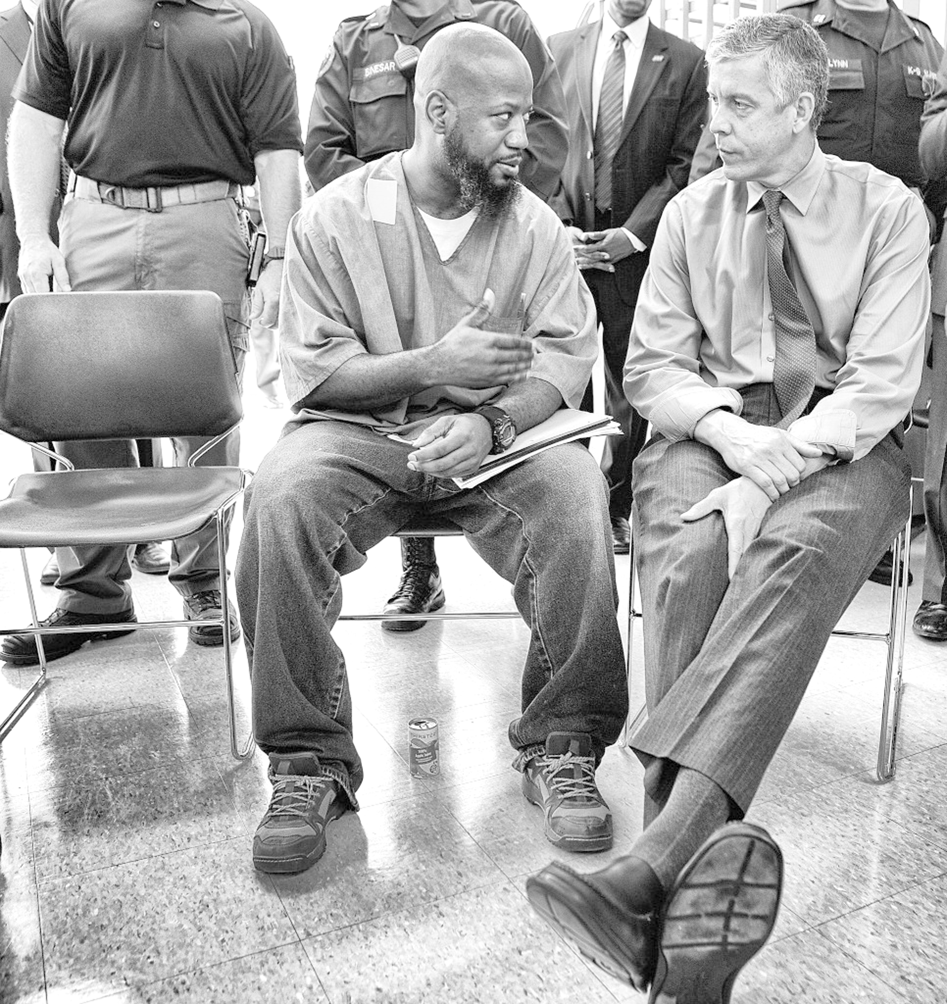 Education Secretary Arne Duncan speaks with a participant in the Goucher College Prison Education Partnership at the Maryland Correctional Institution.