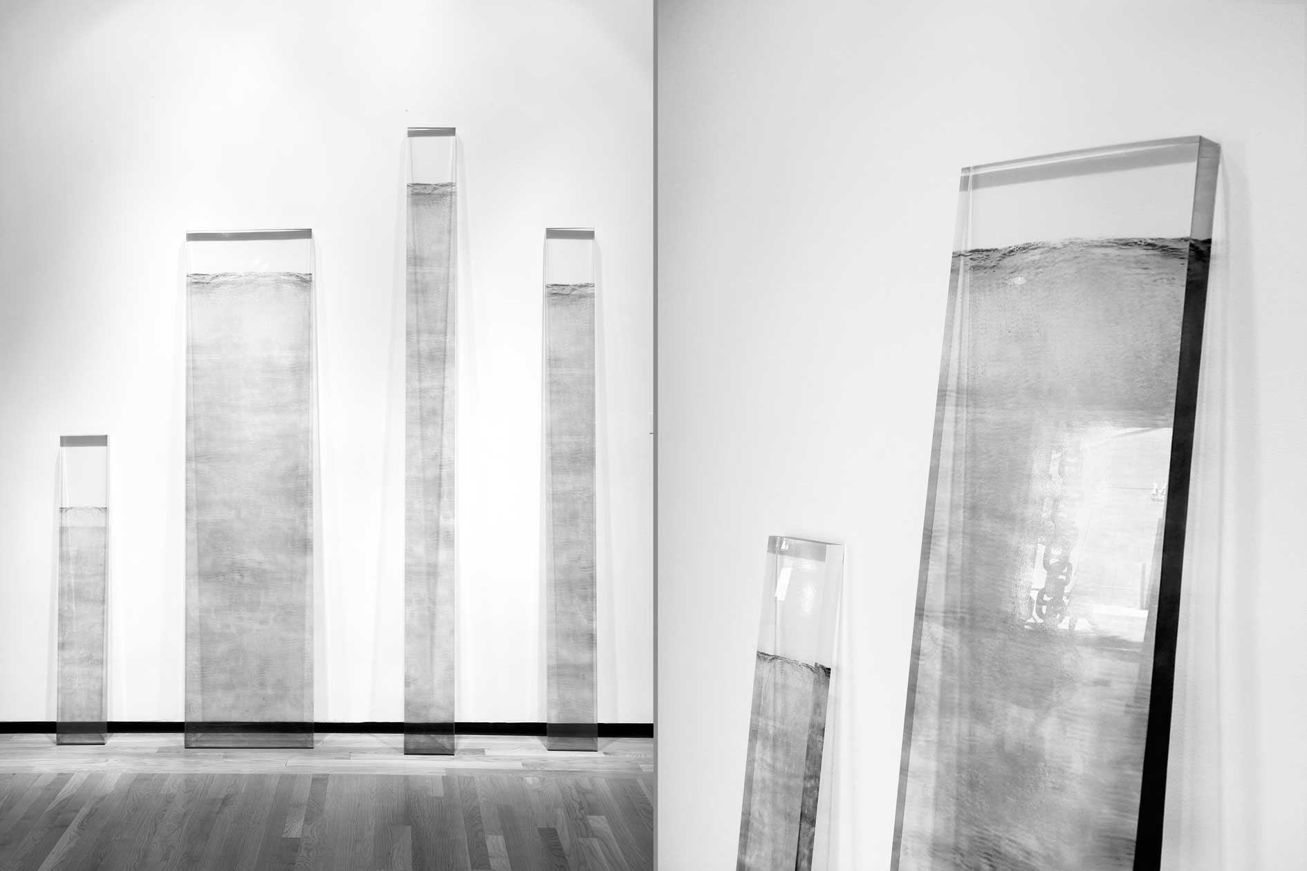 One of the pieces is Dawn DeDeaux’s Water Markers, photographic images of water placed within tall, polished acrylic slabs. Each image is a different height, representing a water mark reached in New Orleans during the flooding caused by the levee failures. None of the marks have a neighborhood label; it’s deliberately left ambiguous.