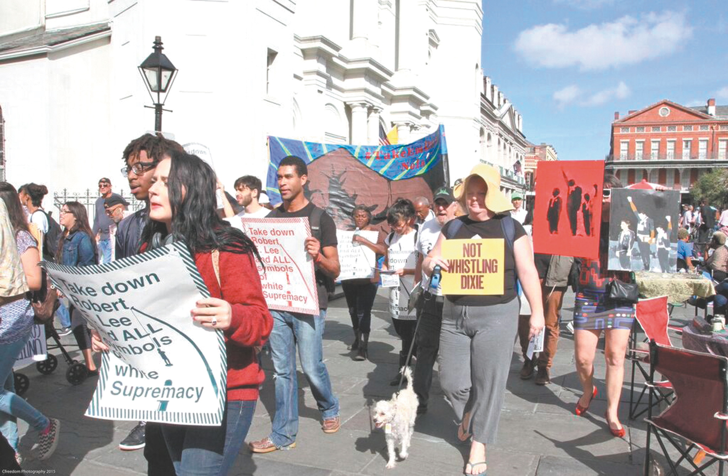 Stopping by the St. Louis Cathedral, organizers’ chanted in sync with a brass band playing for spare change, “Down with white supremacy, up with the people’s empowerment.” Organizers noted the Catholic Church’s deafening silence on slavery, to which it turned a blind eye and Jim Crow, which it honored by making Blacks in the church’s congregation sit in the back pews, until the Brown v. Board of Education decision.